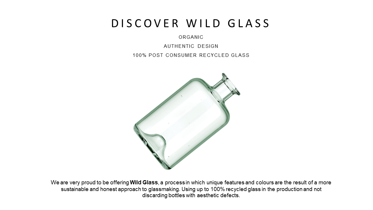 We are very proud to be offering Wild Glass, a process in which unique features and colours are the result of a more sustainable and honest approach to glassmaking. Using up to 100% recycled glass in the production and not discarding bottles with aesthetic defects.